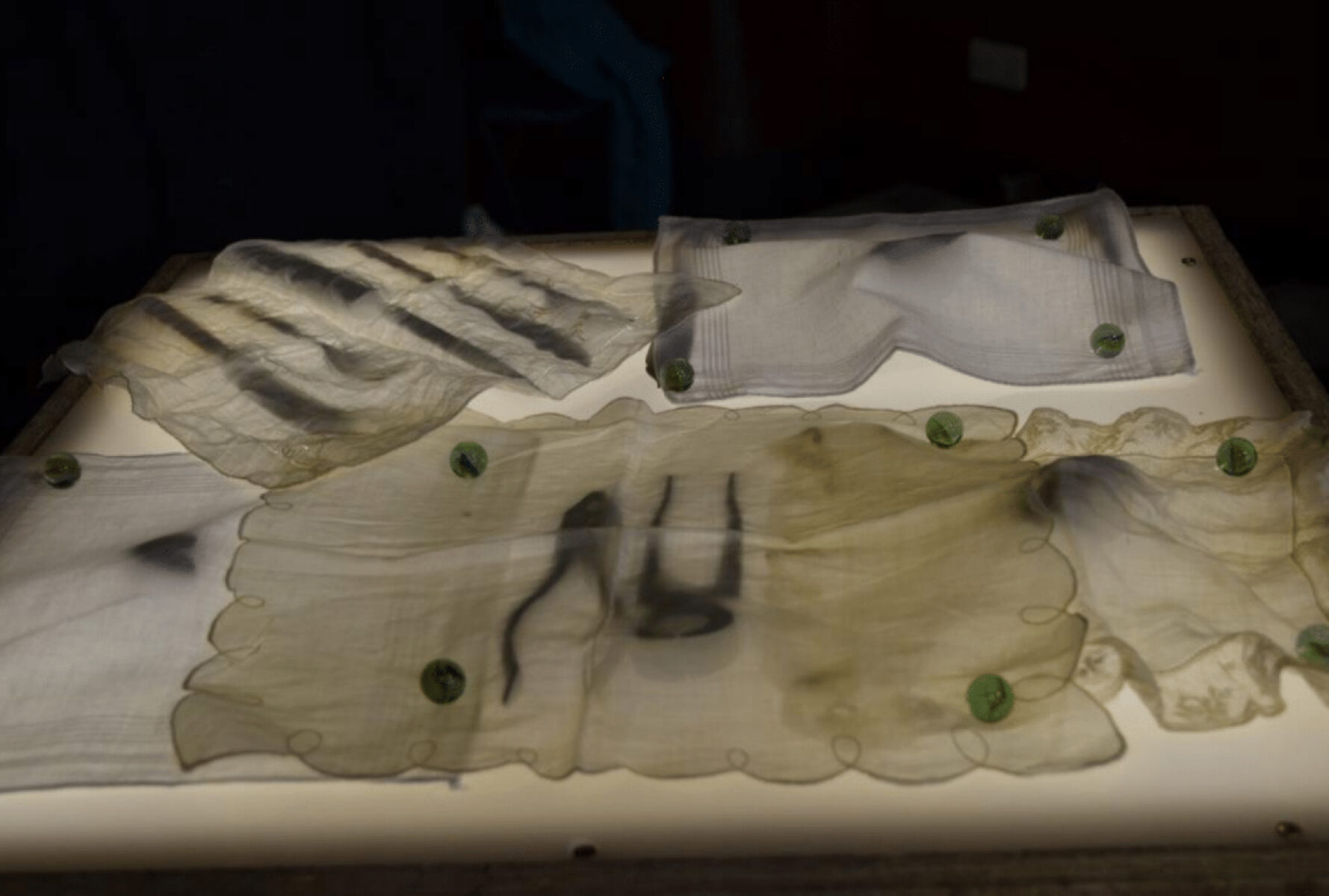 I am thinking of Rosie, lying full stretch on the floor, while Aldona wraps white tissue paper around her, resonant of different images: preserving a body; wrapping a gift; parcelling up fragile china teacups so that they do not break when carried from one home to another. Then slowly, slowly Rosie pulls herself out, as if emerging from a cocoon, leaving the tissue, itself fragile, behind. A snake skin. A ghost. A white shadow.’