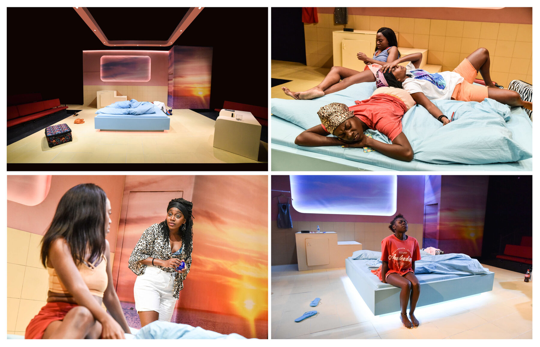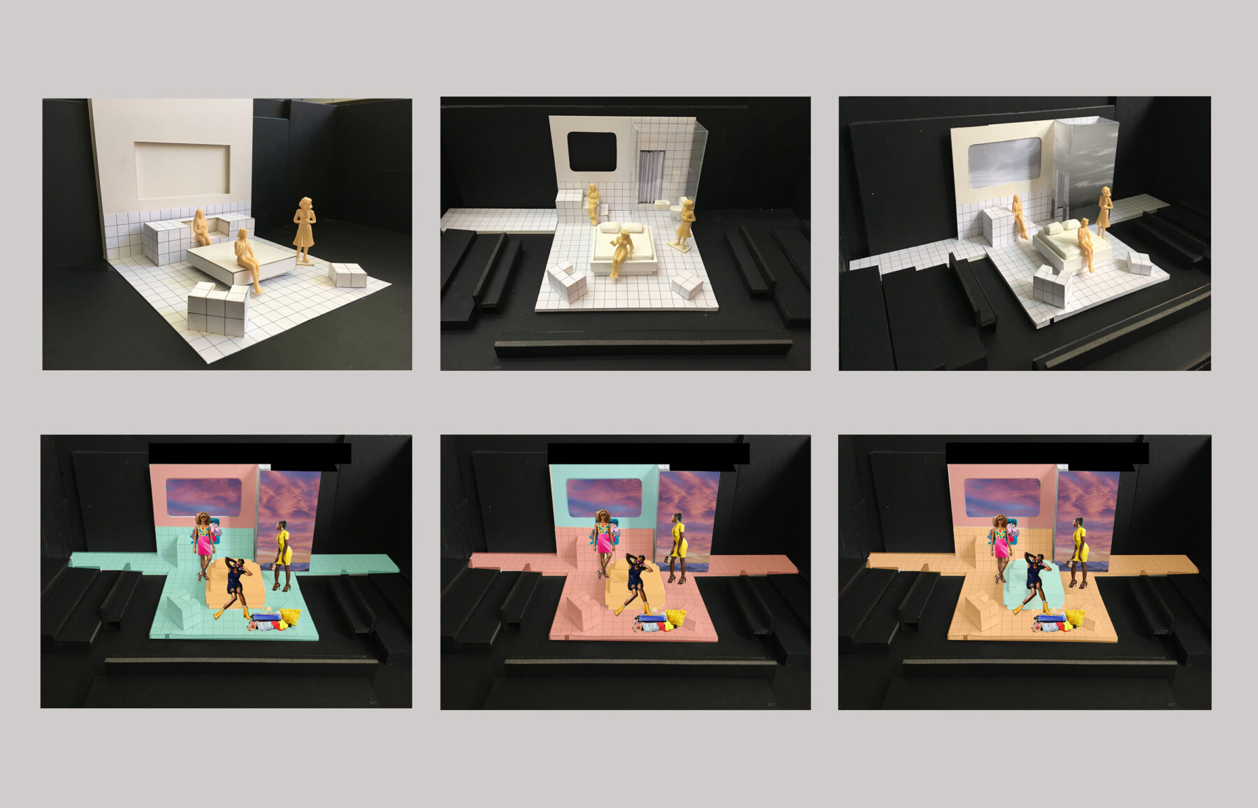 Simultaneously, we wanted to stay true to the attractive and joyous fashion choices of the girls, and didn’t want to overwhelm the costumes with too vibrant a set. We divided the space into block areas of pastel colour with a graphic which could be a sunset or sunrise depending on how you interpret the characters’ musings on what it means to be 25. This was contrasted with a wildly eclectic palette for the costumes full of busy patterns so the drama was supported by a warm, playful space without drowning out its inhabitants.