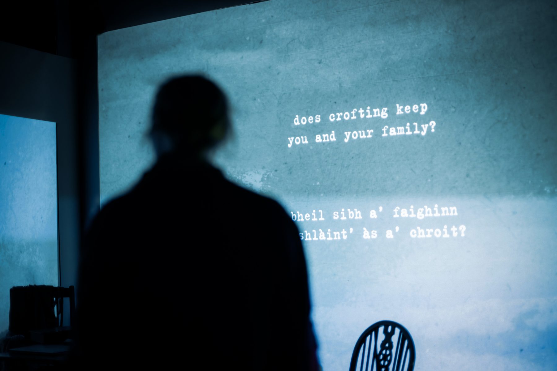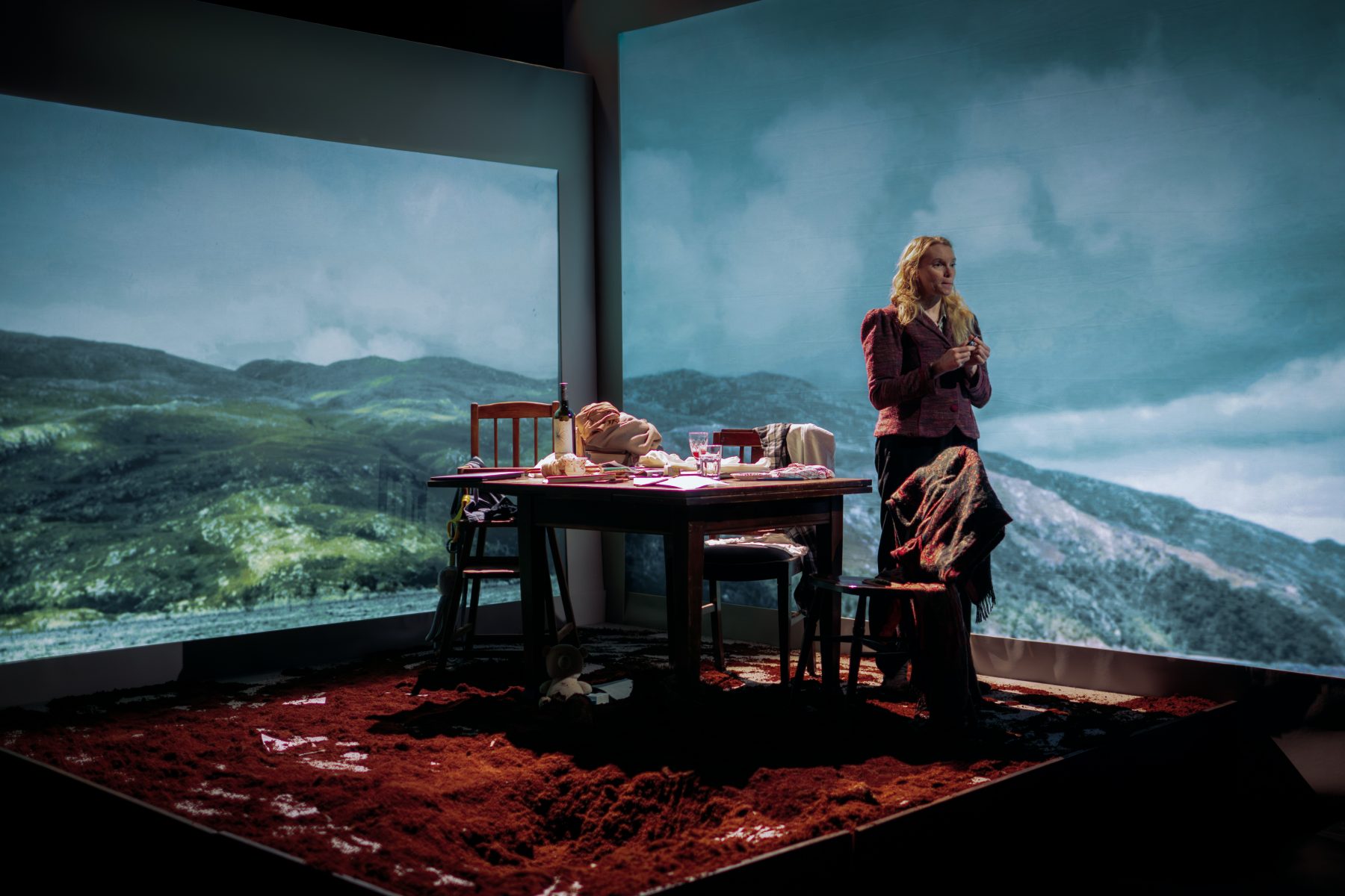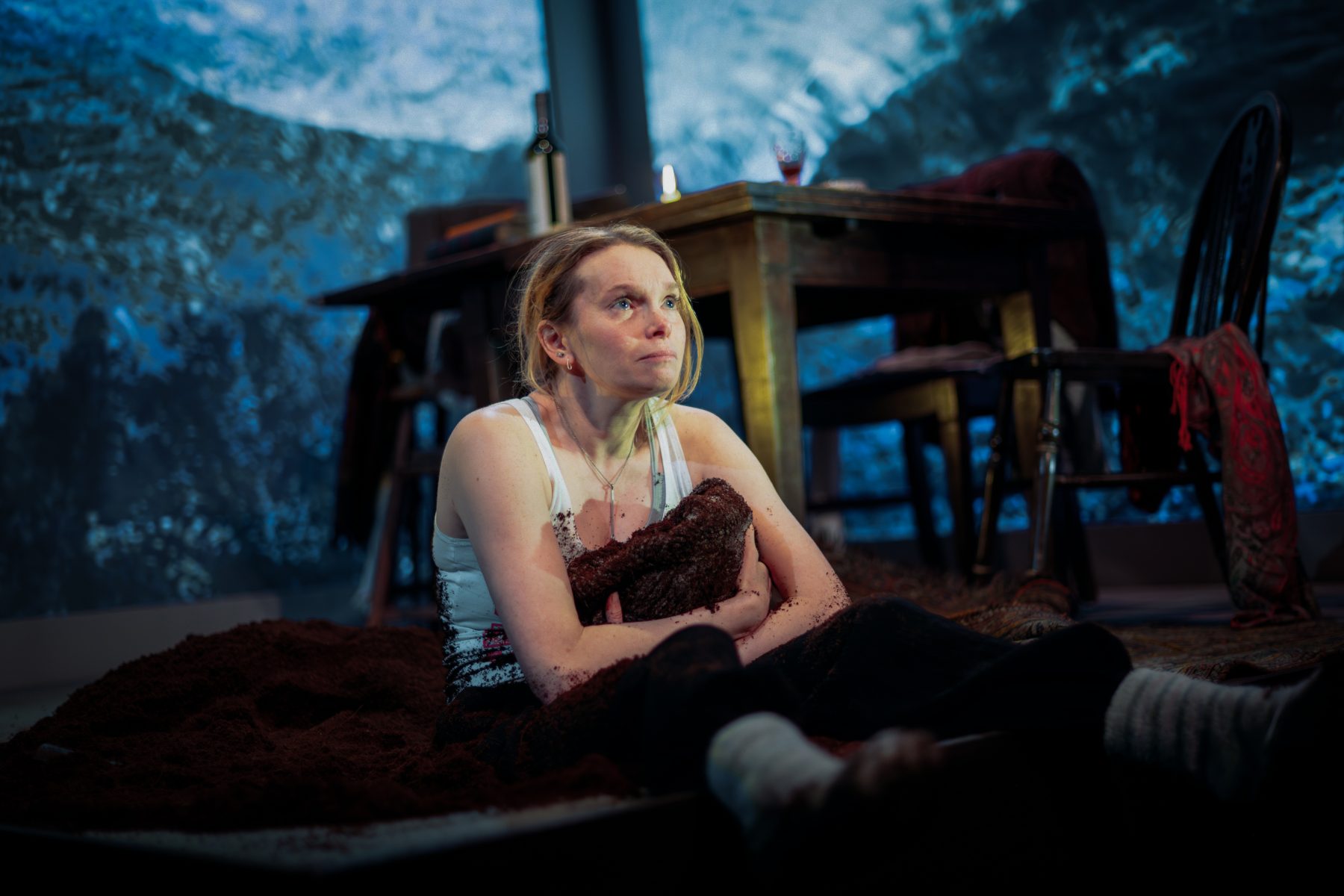 Night Waking was created on the Isle of Mull and designed to tour to theatres, town halls and community centres in the most remote parts of the Highlands and Islands of Scotland. My design featured a domestic setting, perched on top of a pit of soil which was spread across the set throughout the play, and enveloped by projected landscapes which I filmed on the Isle of Mull.