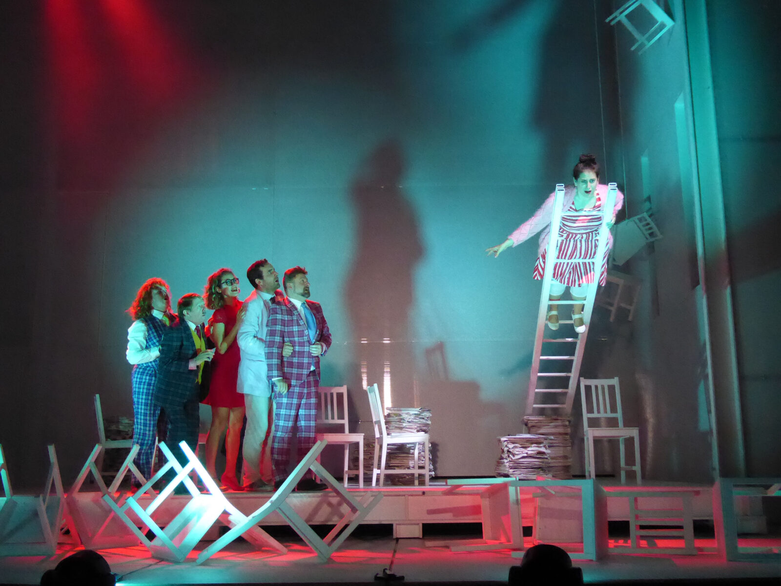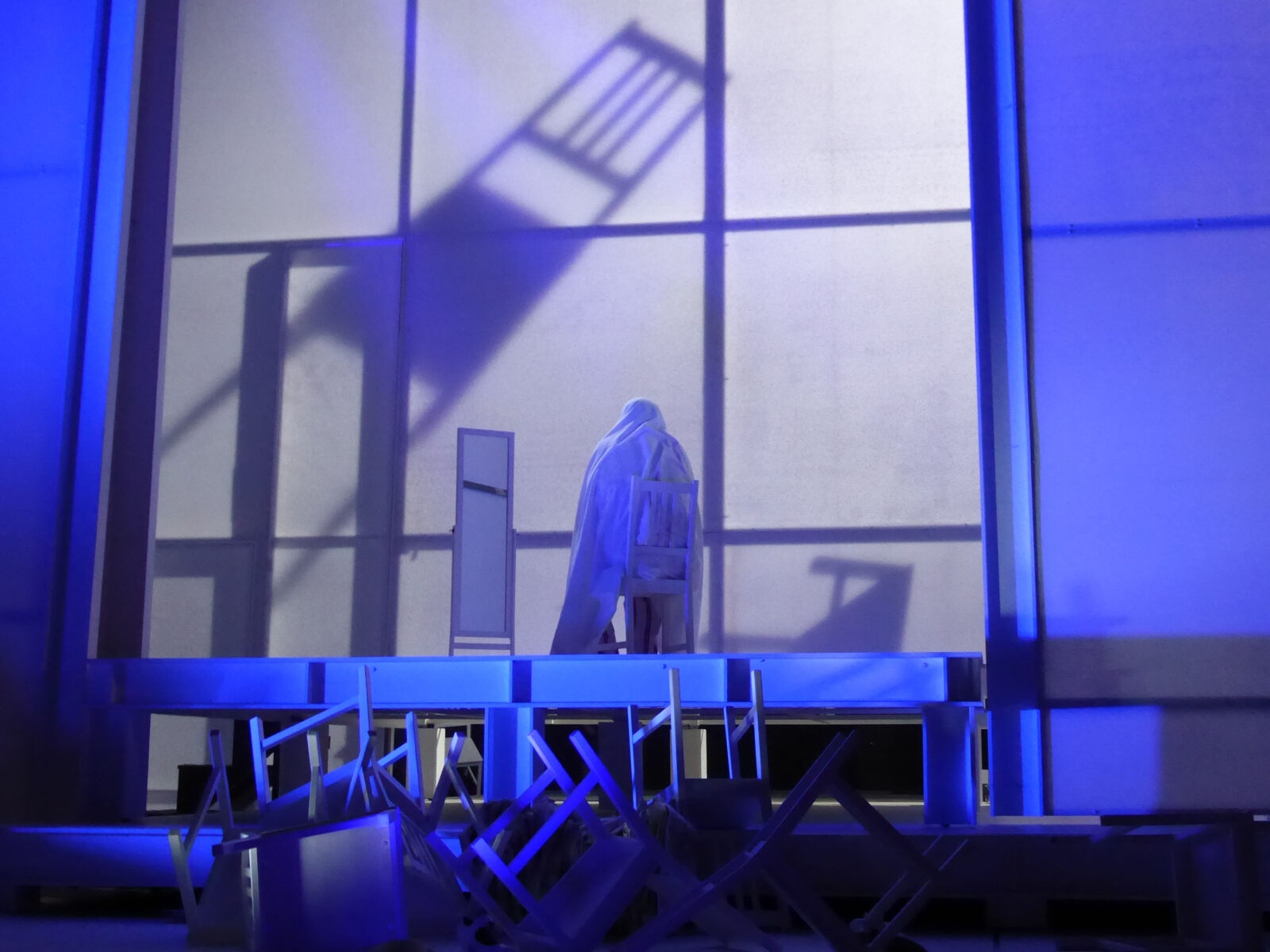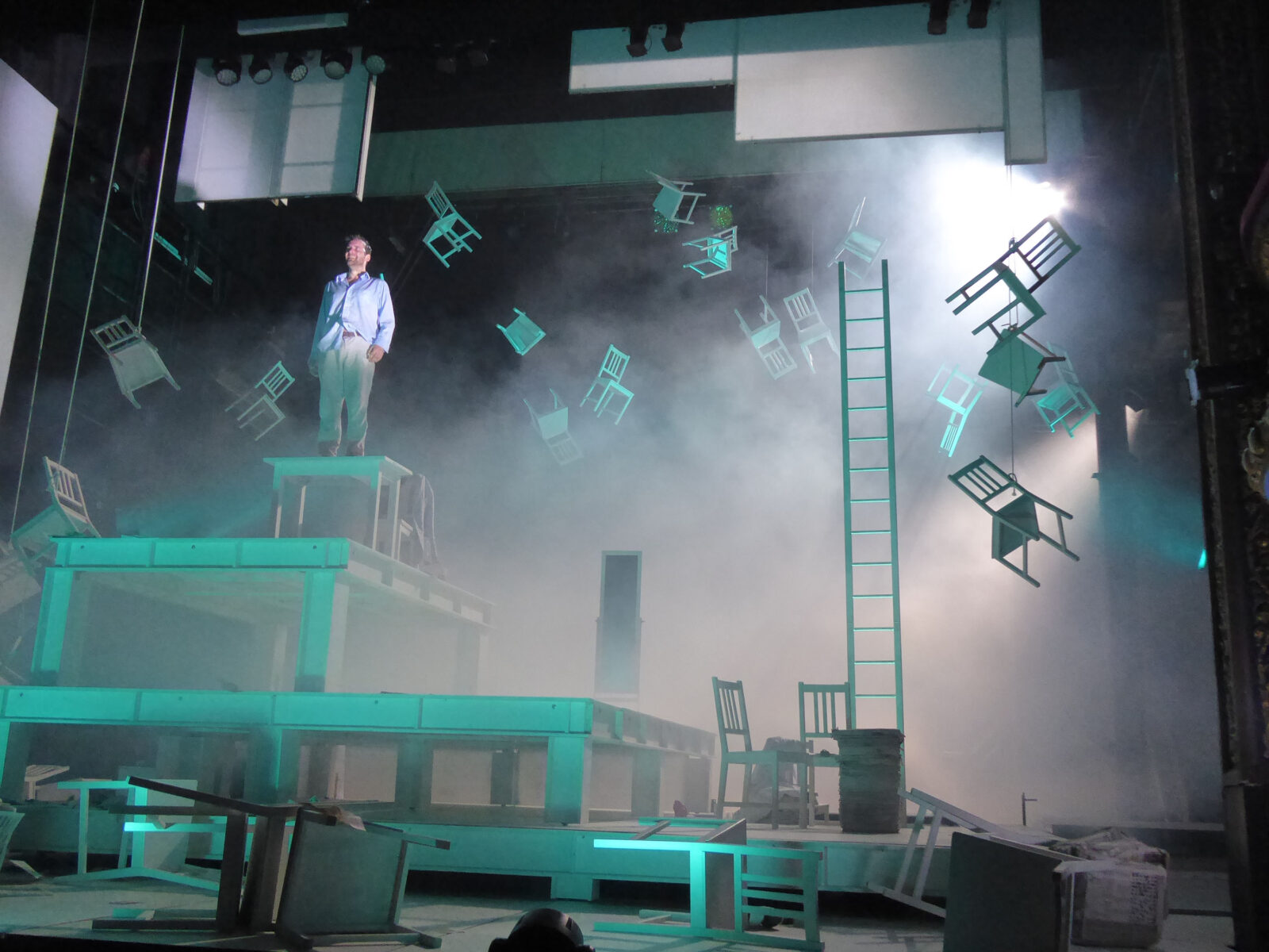 The productions bold cartoon-like approach saw the world of Beringer (Robert Jack) gradually diminish as platform after platform and a series of narrowing framing portals closed down his space, in the final image he is left as sole human in a world of chaos. Winner of CATS award for best production in Scotland 17